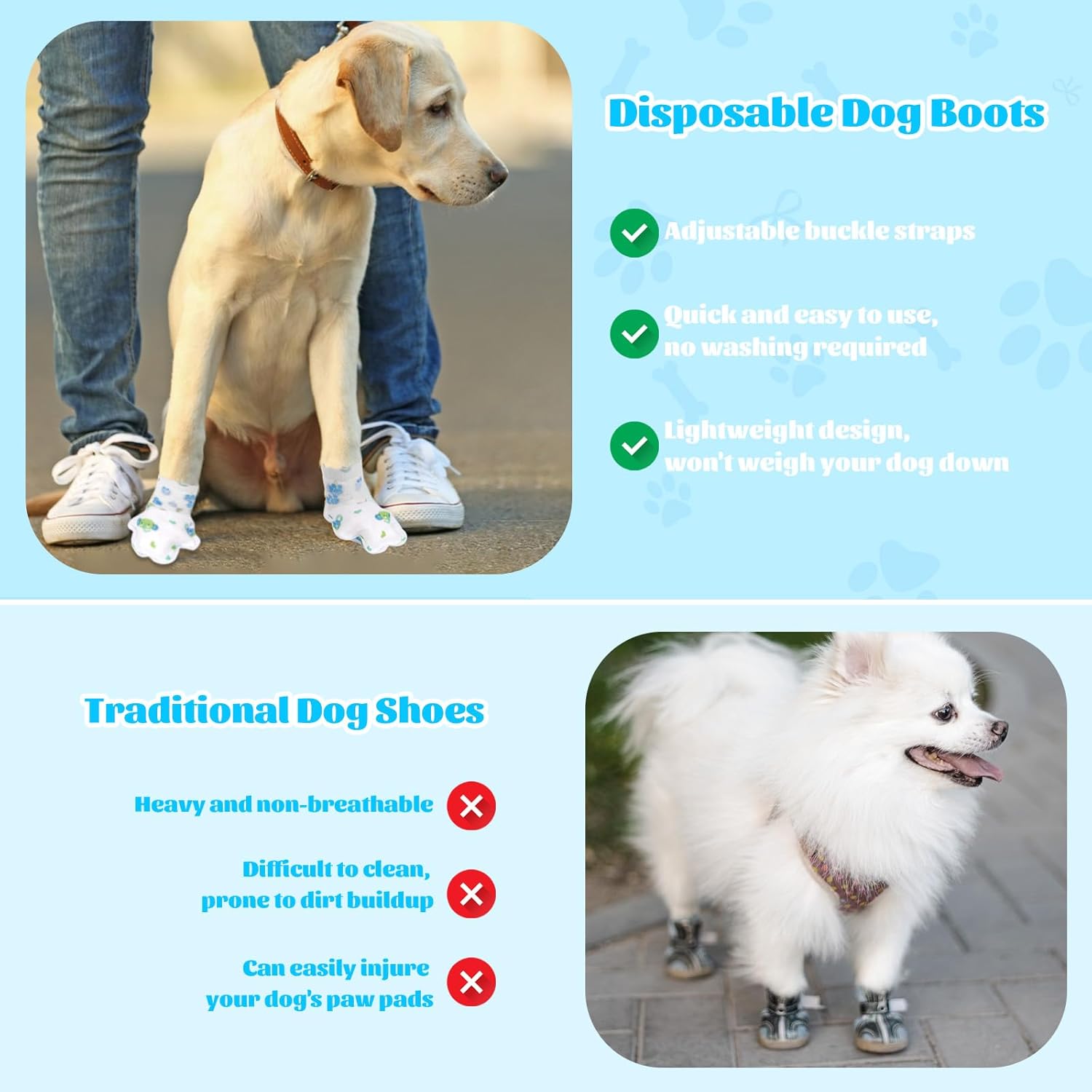 Package Contents and Dimensions: Contains 40 disposable dog boots and 6 reusable straps. For a secure and comfortable fit (Bandage colour is random)
