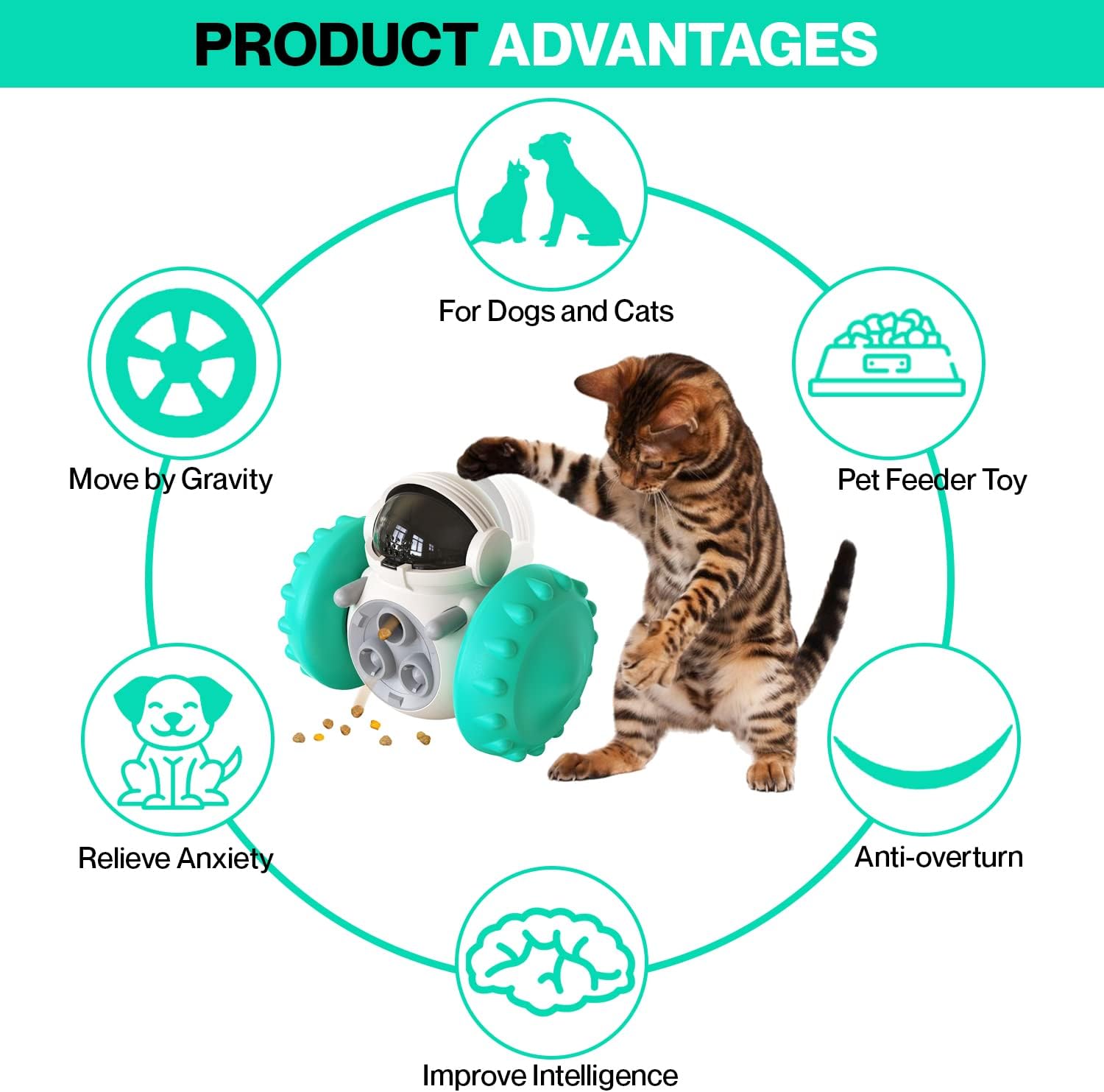 ✅【Premium Quality & Pet Safe】This pet toy food dispensing has been constructed of premium ABS suitable for dogs. The dog food dispenser toy has been meticulously designed in the shape of a robot with 2 wheels on the side for mobility to keep your pet active while they search for treats. This pet food toy is sturdy, long-lasting, non-toxic, and secure, suitable for small and medium-sized dogs, cats, and other pets.