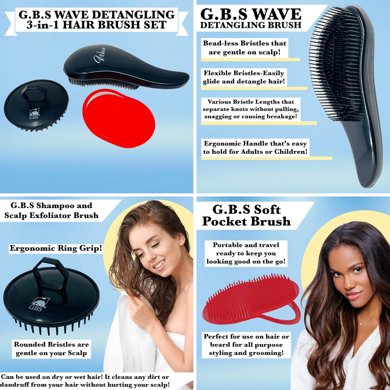 Great Brushes! They work great on my long hair and short hair cats..Once I got them home I seen that the wave brush is typically for human hair and I have a daughter with very thick hair and it detangles amazingly..I use the other two for the cats. You cannot beat the price for the products.